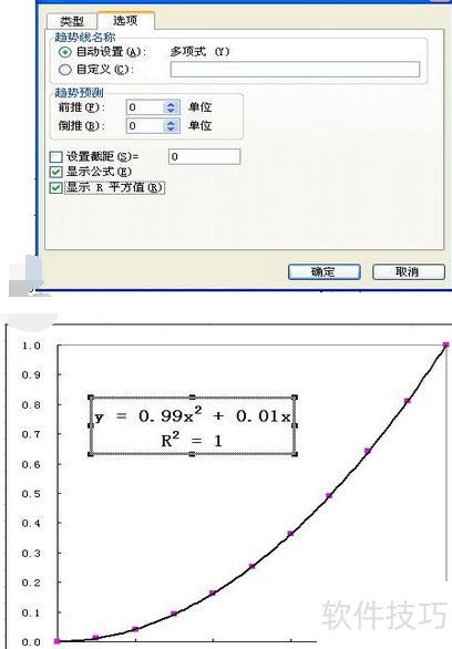 切换至选项选项卡,勾选显示公式复选框,根据需要可选择设置截距=0。为评估拟合效果,建议同时勾选显示R平方值。R平方越接近1,表示拟合程度越高;本例中R平方为1,表明曲线完全拟合,为最优趋势线。确认后6所示,图中显示的公式即为回归分析所得的拟合曲线方程。
