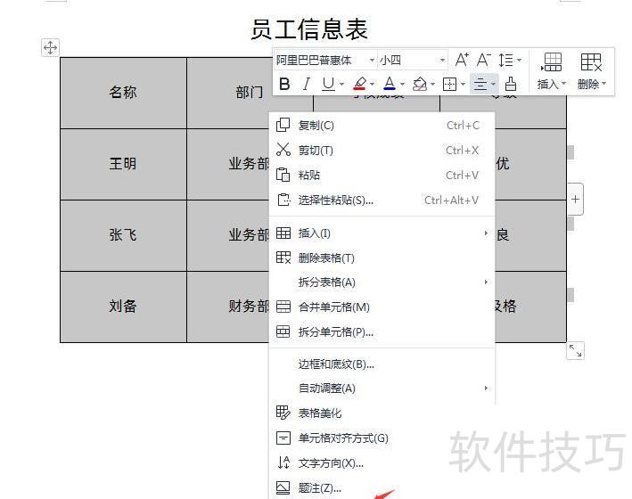 先选中整个表格,将鼠标置于其上,右键点击并选择,所示。