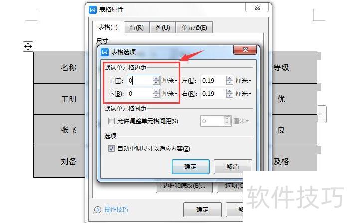在表格属性对话框中,点击底部按钮,若默认单元格边距的上下值被设置,将导致行高无法调整,所示。