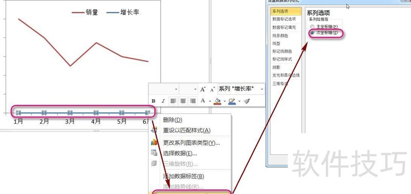 将增长率系列选中,右键选择设置数据系列格式,勾选次坐标轴即可显示在次坐标轴上。