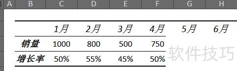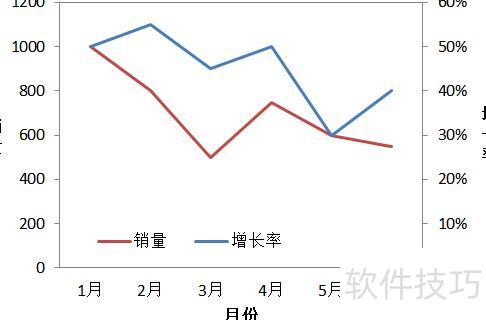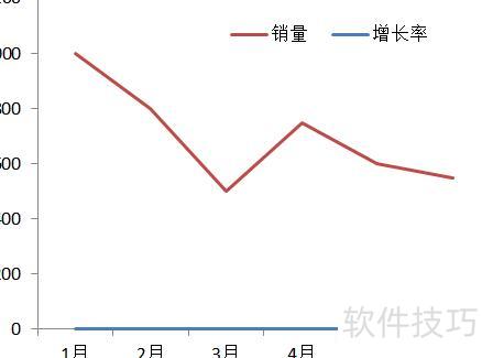 选中B2:H4区域插入折线图,因销量与增长率数值差距较大,导致销量数据遮蔽了增长率的呈现效果。