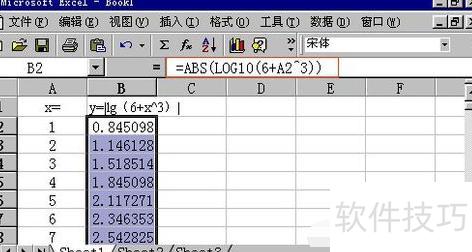 在B2单元格输入公式=ABS(LOG10(6+A2^3)),即可立即显示计算结果。随后选中B2单元格,将鼠标移至其右下角的黑色小方块■处,待光标变为十字+后,按住鼠标沿B列向下拖动至目标位置,即可自动填充并完成其余函数值的计算。