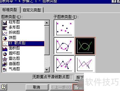 单击工具栏中的图表向导按钮,选择X,Y散点图,再从中选取无数据点平滑线散点图类型。此时预览所生成的函数图像,会发现其呈现的曲线并非所需的函数图形,需进一步调整设置以获得正确结果。