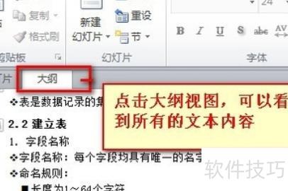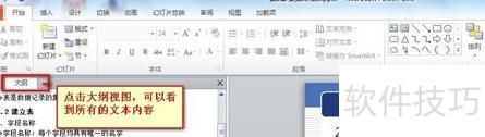 打开PPT后,默认为幻灯片视图,需切换至大纲视图进行操作。