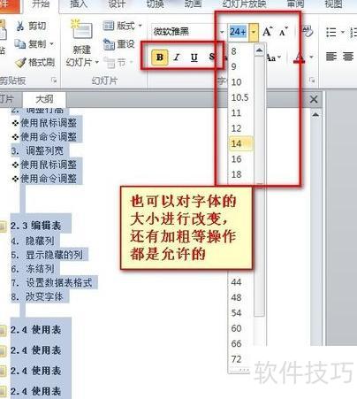 此时,PPT中的所有文字将以大纲形式呈现,便于进行编辑操作。可直接全选文字,也可使用快捷键完成全选,具体效果所示。