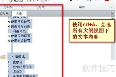 在新界面中,PPT的文字将以大纲形式呈现,可直接全选文字,或使用快捷键快速选中全部内容。