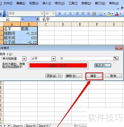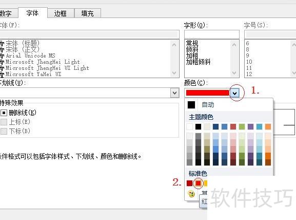 第三步:将字体颜色设为红色,点击确定,返回新建格式规则对话框,关闭所有窗口,完成设置。