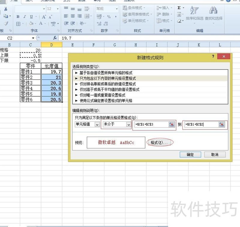 第二步:按图示设置参数,选择未介于规则,下限选择规格右侧的C1单元格,点击加号后选择下限右侧的C3单元格;同样方法设置上限。随后点击格式按钮,弹出设置单元格格式对话框。