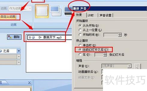 进入动画菜单,点击自定义动画,声音文件已自动添加。右键选中该动画,打开效果选项进行设置:将开始方式设为之前,效果选择从头开始,并设定在当前幻灯片结束后停止播放。在声音设置中勾选播放时隐藏图标。