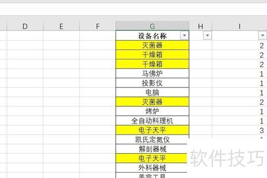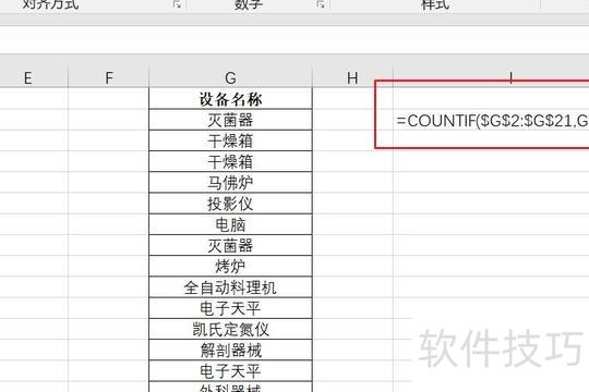 第二种方法是在相邻空白单元格中输入公式 COUNTIF($G$2:$G$21,G2),然后向下拖动填充至所有数据末尾。其中 $G$2:$G$21 为固定的数据查找范围,采用绝对引用方式。若结果显示为1,表示该数据仅出现一次,无重复;显示为2,代表有两个相同值;显示为3,则表示有三个重复项。