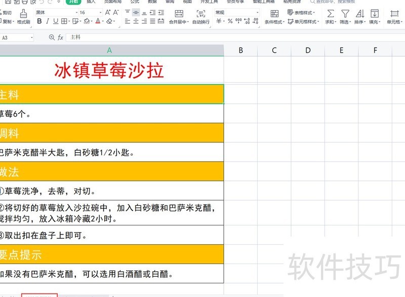 所示,WPS工作簿包含三张工作表:冰镇草莓沙拉、Sheet2和Sheet3。现将第一张工作表冰镇草莓沙拉单独导出为PDF文件。