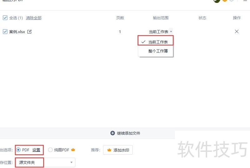 在弹出的输出为PDF对话框中,将输出范围设为当前工作表,即冰镇草莓沙拉工作表;输出选项选择PDF;保存位置选择源文件夹,最后点击开始输出按钮完成操作。