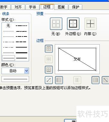 弹出单元格格式窗口,切换至边框选项卡,点击斜线按钮设置斜线样式,所示。