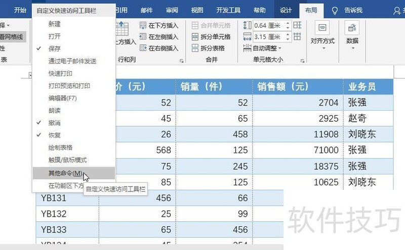 第二步:添加功能区中没有的功能,点击快速访问工具栏的下拉箭头,选择其他命令进行设置。