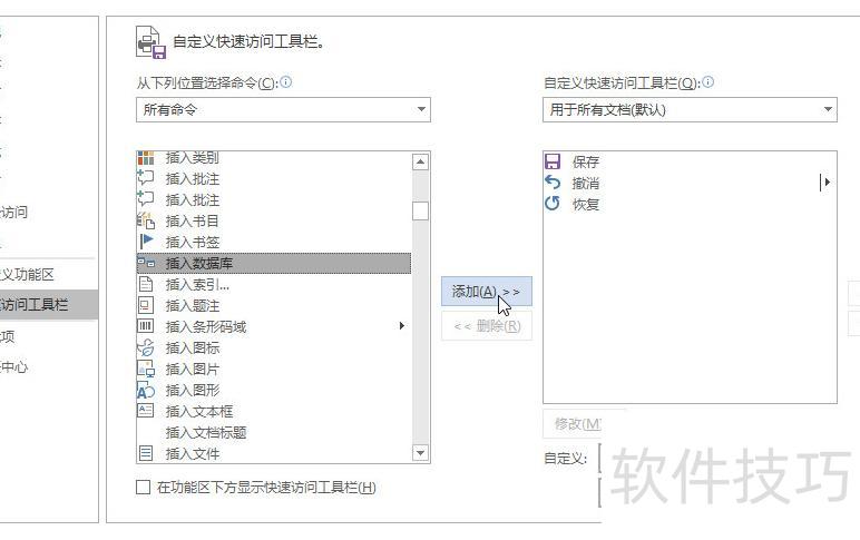 第三步:将插入数据库功能添加至快速访问工具栏,操作所示。
