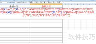 将A2作为目标单元格,在B2中输入以下公式:=IF(A2=0,,IF(A2<0,负,)&SUBSTITUTE(SUBSTITUTE(SUBSTITUTE(SUBSTITUTE(TEXT(INT(ABS(A2)),)&元&TEXT(RIGHT(TEXT(A2,.00),2),0角0分),零角零分,整),零分,整),零角,零),零元零,))。该公式的作用是将A2中的数字转换为中文大写金额格式。首先判断A2是否为零,若为零则返回空值;若为负数,则添加负字,并取其绝对值进行处理。接着利用TEXT函数将整数部分转换为汉字并加上元,小数部分转换为角分格式。通过嵌套的SUBSTITUTE函数依次将零角零分替换为整,零分和零角替换为整或零,并处理零元零等冗余情况,最终输出符合中文金额书写规范的结果。