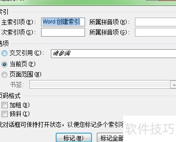 主索引项框中会自动显示word创建索引,确认无误后点击标记按钮,即可完成首个关键词word创建索引的标注操作。