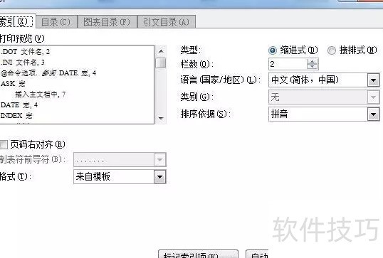 完成上述索引标记后,即可提取已标注的索引。在文档末尾,点击标记索引项旁的插入索引按钮,可自定义索引格式,排序方式提供笔划与拼音两种,默认按笔划排序。