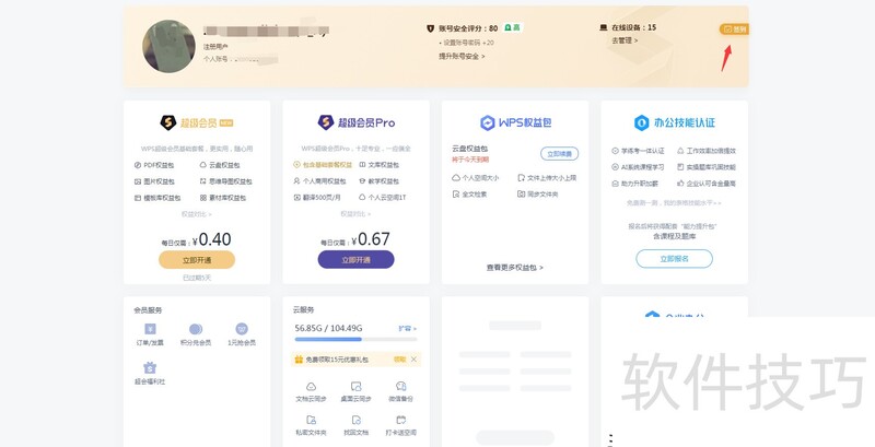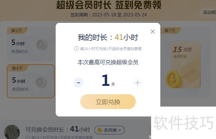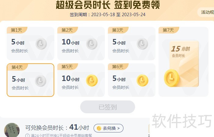 每日签到可获不同期限的WPS超级会员基础套餐,累计满24小时可兑换一天使用时长。