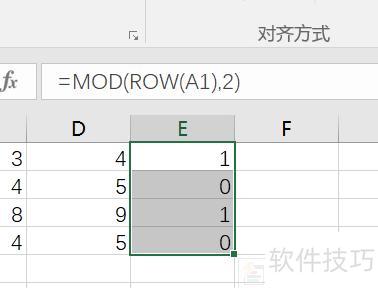 此时按下Ctrl+回车键填充公式,单元格将显示1或0,其中1表示奇数行,0表示偶数行。
