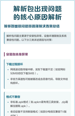 解析包出错可能因安装包不完整、APK版本不兼容、设备不支持中文路径或长文件名、安装文件过大导致内存不足。解决方法包括重新下载安装包、重命名文件为英文、清理内存或更换设备。
