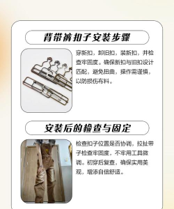 背带裤扣子安装需将带子穿入方形扣和葫芦扣,调整尾端长度确保美观与稳固。