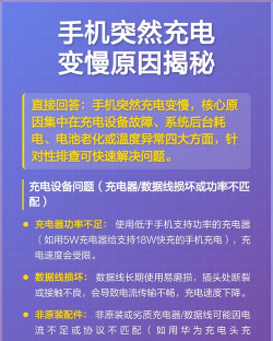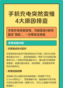 手机充电速度变慢可能由充电线或插头不匹配、接口积灰、电池老化或过度放电等因素引起,建议使用原装配件并定期清理接口。