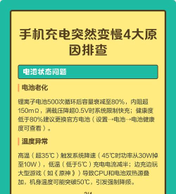 手机充电变慢可能因充电线或插头不匹配、接口积灰、温度过高或过低、电池老化或过度放电导致。建议使用原装配件,定期清理接口,避免边充电边使用,并在关机或飞行模式下充电以提升速度。