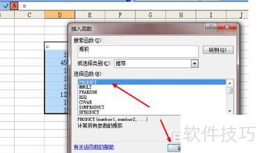 弹出菜单中无所需乘积公式,可点击其他函数选项查找。