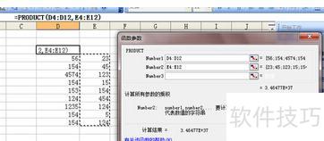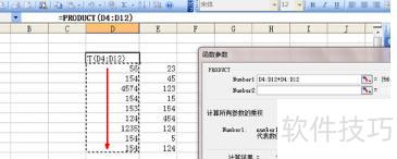 此时开始计算第一组数据的乘积。用鼠标选中该组数据,选中后数据区域会以虚线框出,函数参数框中将显示所选范围,页面底部同步呈现计算结果,所示。