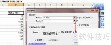 完成第一组数据乘积计算后,接下来需计算第二组数据的乘积。请单击函数参数页面中number2右侧的按钮,所示,点击该按钮即可开始选择下一组数据。