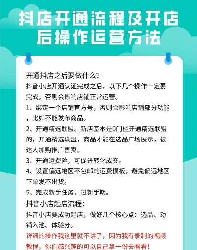 抖音店铺功能开通需注册抖音小店,选择个体营业执照,提交资质信息如营业执照、法人身份证明及店铺LOGO,缴纳保证金并等待审核。