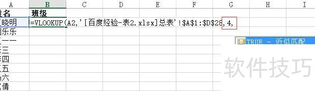 =VLOOKUP(*&B1&*,A1:A7,1,) 表示在 A1 至 A1:A7 区域中查找包含 B1 单元格内容的文本,并返回该区域第一列对应的结果。其中,*为通配符,代表任意数量的字符,前后加上*表示只要单元格中包含 B1 的内容即可匹配成功。第三个参数1表示返回查找区域的第一列数据。末尾逗号后省略的部分表示精确匹配模式,也可显式写为 0 或 FALSE,确保只返回完全符合模糊条件的首个匹配项。此公式适用于查找含有特定关键字的文本内容。