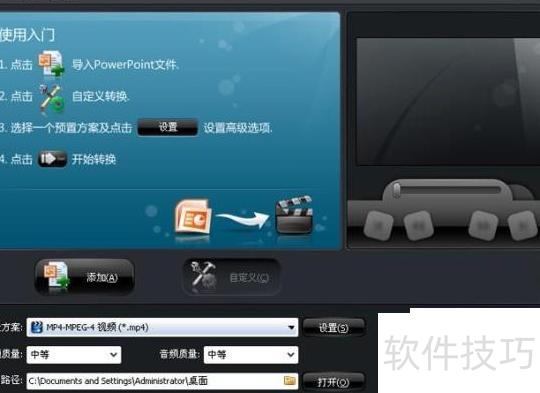 1、选定PPT文件;2、指定输出文件夹;3、设置视频帧率;4、选择输出视频格式;5、勾选使用现有计时,以应用预设的排练时间;6、设定分辨率为640×480等参数。全部设置完成后,点击开始按钮,即可启动转换进程,将演示文稿转为视频文件。