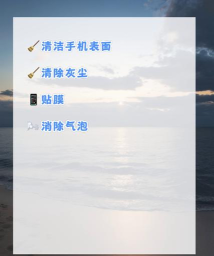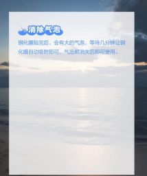 1、先用酒精湿巾擦拭手机屏幕 2、用无纺布把酒精擦干,清理屏幕 3、架上贴膜神器.这里要注意不要让贴膜神器带入各种灰尘、各种毛什么的,如果发现有“不干净”的东西,再重复1、2步 4、用除尘贴把屏幕上的细小东西粘贴清除, 一定要保证屏幕干净 5、贴膜: 先把钢化膜卡在贴膜神器的顶部,卡准位置后再慢慢放下来. 这个时候你会看到钢化膜已经完全放置在神器中,完美地贴在屏幕上了 6、戳:用手指从手机顶部滑动...