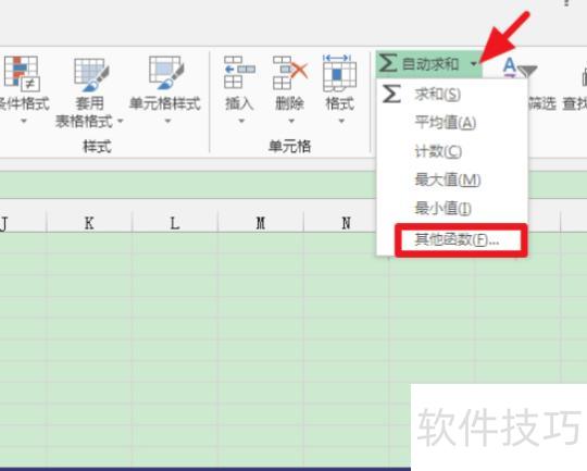 2.单击开始选项卡中自动求和旁边的下拉箭头,展开菜单后选择其他函数,操作所示。