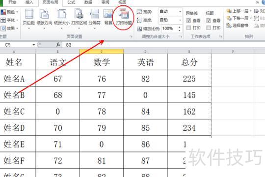 在Excel的页面布局选项卡中,点击打印标题按钮。