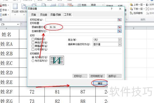 在标题行下方的文本框中输入$1:$1(可按需更改行号作为标题栏),然后点击右下角确定按钮完成设置。