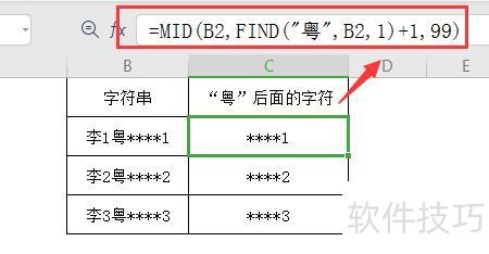 输入公式:=MID(B2,FIND(粤,B2,1)+1,99),按回车键确认。该公式用于提取B2单元格中粤字后的所有内容。