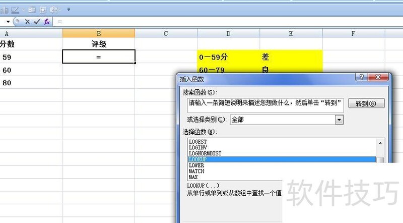 所示,弹出插入函数对话框后,在或选择类别中选定类别,在选择函数中选中所需函数,最后点击确定按钮完成操作。