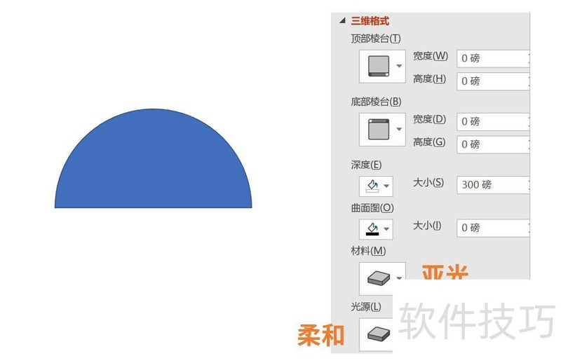 利用PPT的三维格式功能可绘制半圆柱。