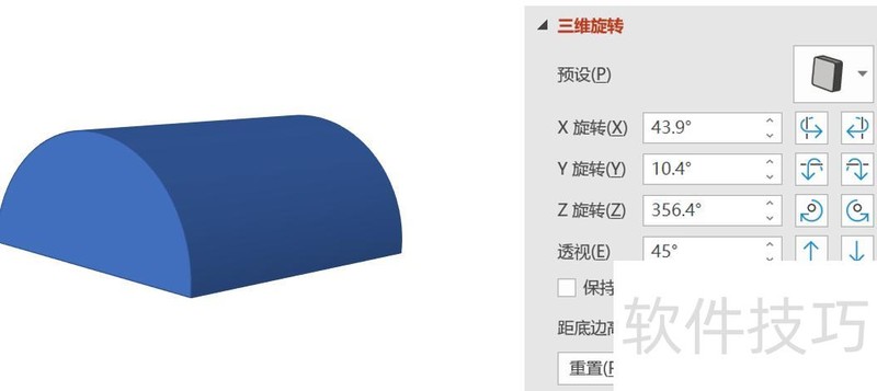 在「三维旋转」中,设定特定旋转角度或选用预设旋转方式,即可呈现半圆柱体。此前步骤中的「深度」实际决定了半圆柱的高度。之所以称作「深度」,是因为在进行三维旋转前,该数值是沿垂直于屏幕平面的方向延伸的,这一方向在三维空间中通常被定义为深度方向。
