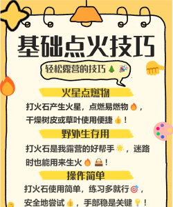 使用打火石时,需练习摩擦动作,保持45度角快上快下,火绒要干燥蓬松,如卫生纸或羽绒,以提高点燃效率。