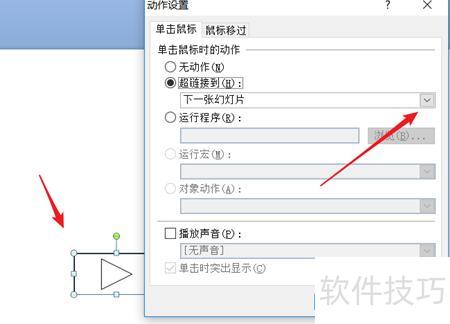 在幻灯片中拖动鼠标完成插入后,页面将自动弹出动作设置按钮,点击超链接到右侧的下拉箭头即可。