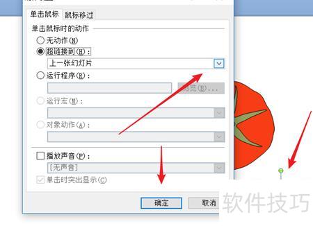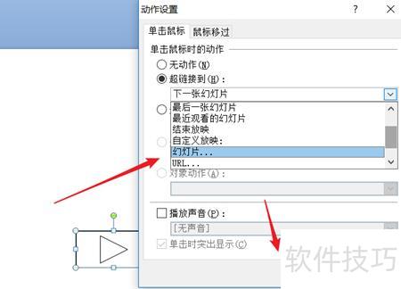 在展开的菜单中选择幻灯片,点击目标幻灯片完成跳转设置,最后点击确定保存。