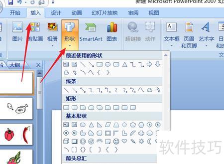 打开PPT文件,选中目标幻灯片,点击插入选项卡中的形状按钮,选择所需图形进行添加。