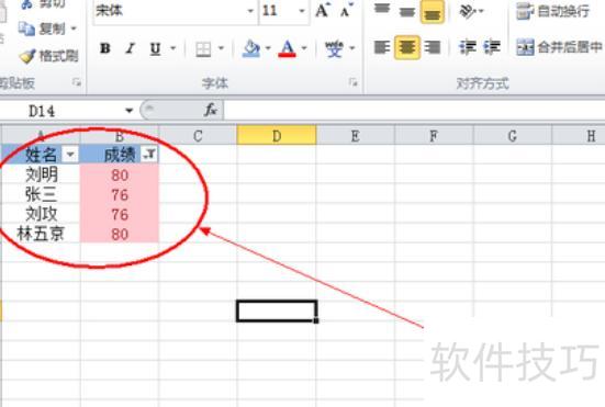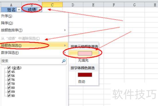 在需筛选重复数据的列(如成绩列)中,点击下拉箭头,选择按颜色筛选,然后勾选粉红色即可。