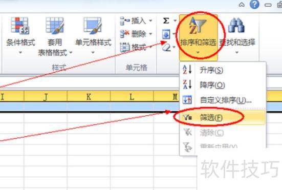 点击开始菜单中的排序和筛选→筛选,为表格添加筛选功能;若无标题行,需在首行插入空白行,并将其选中作为筛选行。