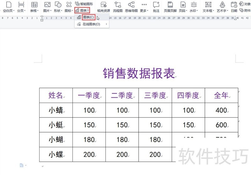将光标置于表格下方需插入图表的位置,点击选项卡中按钮右侧的下拉箭头,从列表中选择即可。