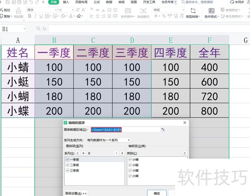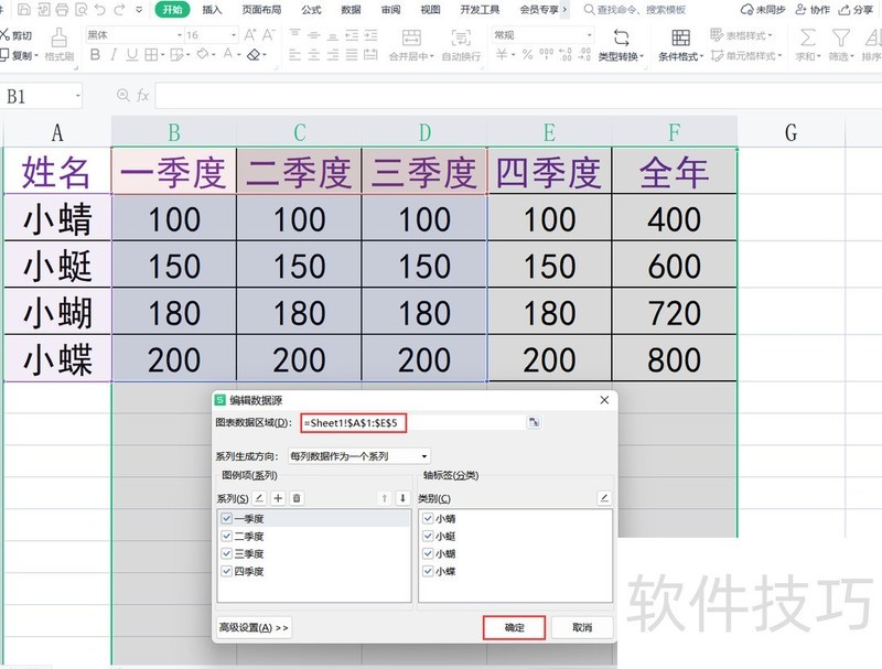 在对话框中,将的默认内容=Sheet1!$A$1:$D$5修改为=Sheet1!$A$1:$E$5,然后点击确定按钮完成设置。